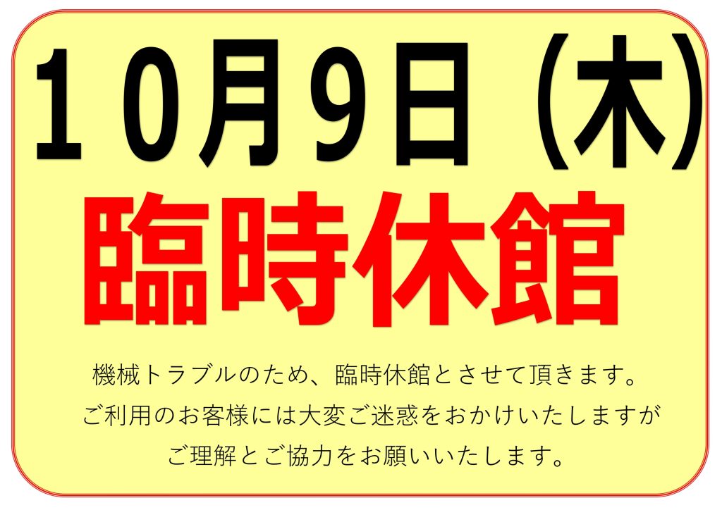 10月9日(木)機械トラブルのため、全館臨時休館といたします。